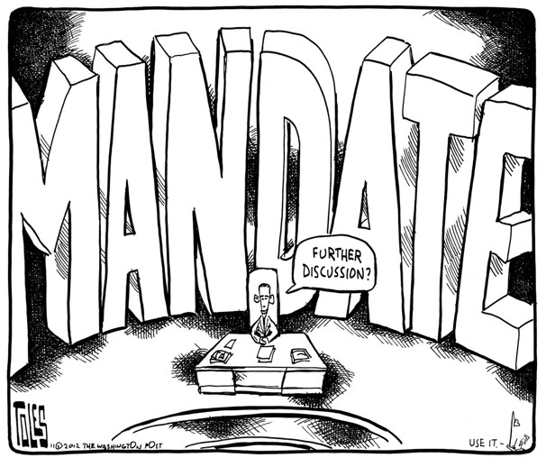 Several weeks have passed since President Barack Obama officially won a second term, and the political press is desperately trying to figure out one important question, one that is even more important than war or the country’s finances. The question is….Does Obama have a mandate? Yes, unlike those other pieces of political discussion that you know, make a difference for the country’s future, we are stuck trying to figure out this burning question of all importance.